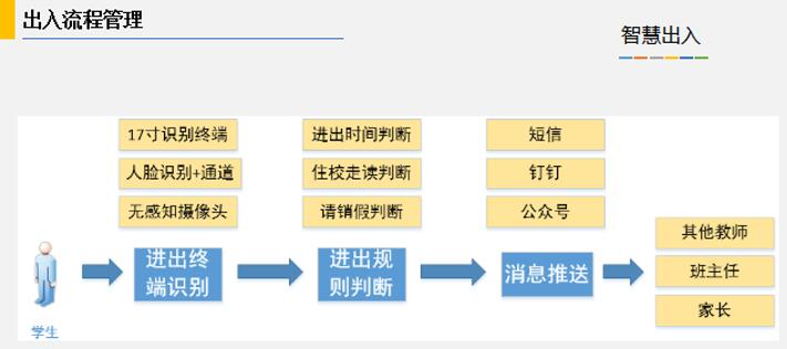 智慧出入主要體現身份識別的功能,在校門(mén)、宿舍入口人員出入通道配備壁掛式身份識別一體機。學(xué)生在終端上刷卡或刷臉時(shí),軟件會(huì )在屏幕上顯示打卡學(xué)生的個(gè)人信息和照片信息,刷卡時(shí)間等。結合智慧請假系統語(yǔ)音提示該學(xué)生是否請假,協(xié)助安保人員進(jìn)行準確的身份識別。