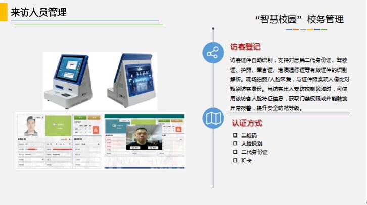 智慧出入解決方案:融合出入規則、人臉通道、身份識別、公示提醒、出入數據展示、家校推送、請假管理、來(lái)訪(fǎng)登記、訪(fǎng)客預約于一體的針對校門(mén)出入應用場(chǎng)景的安全、管理解決方案。